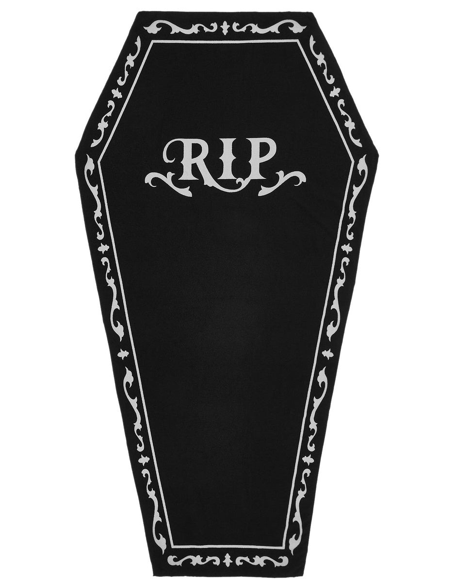 Coffin-shaped beach towel with RIP lettering. The edge of the towel is decorated with ornaments.