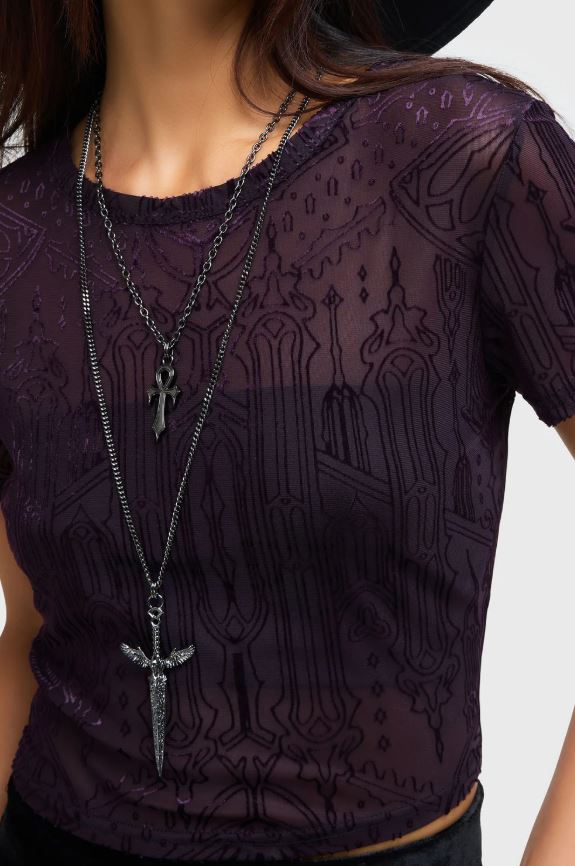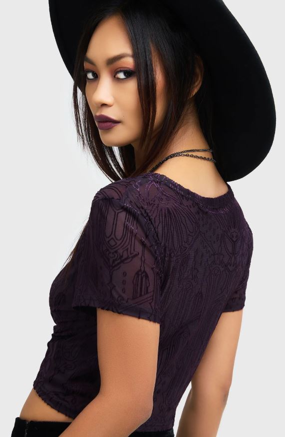 The KILLSTAR "Chapel of Hatred" crop top combines dark elegance with a touch of mysticism. Made from a stretchy fabric, the cathedral velvet design adorns this fitted top, which creates a seductive gothic look with short sleeves and crop top style.