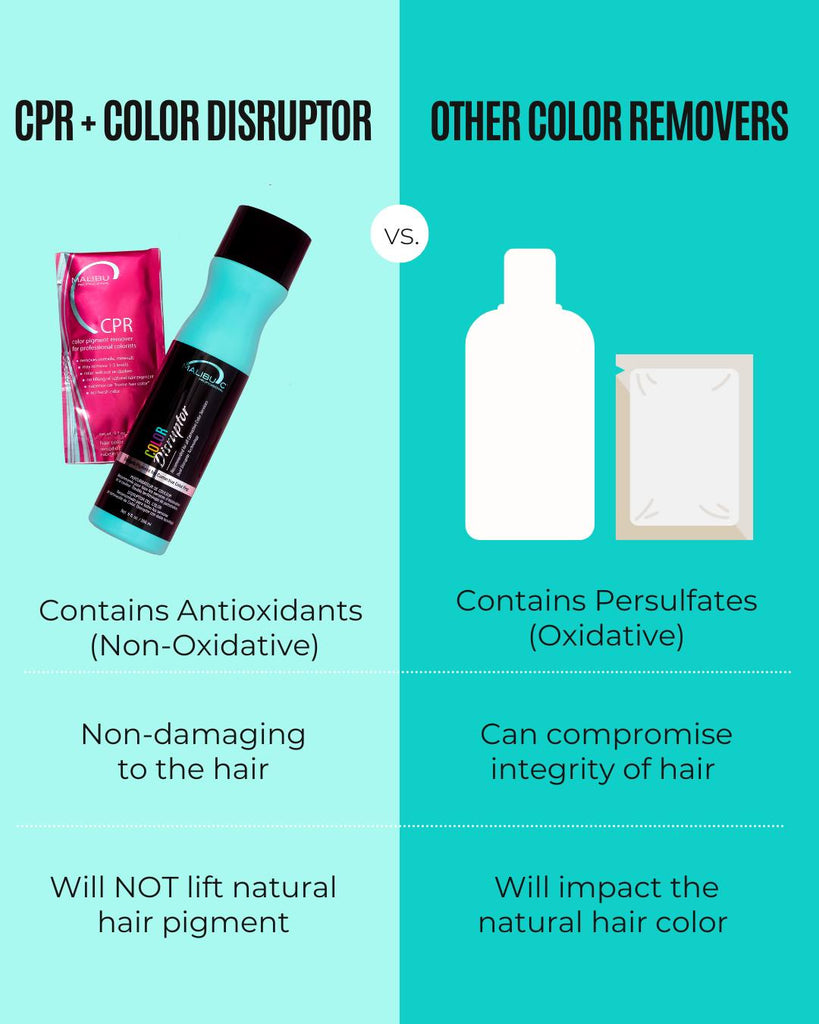 Malibu C Colour Disruptor and CPR - Color Pigment Remover are the first responders in the corrective colour process. Step one is Malibu C Color Disruptor to loosen oil based colour and other stubborn dye molecules for easier removal. CPR is step two, to remove colour and mineral build up for more predictable corrective colour services. Both products are 100% vegan, non-oxidative, and leave the integrity of the hair in-tact. For best results, Malibu C recommends using Un-Do-Goo > 9 pH shampoo after each process for more removal.
